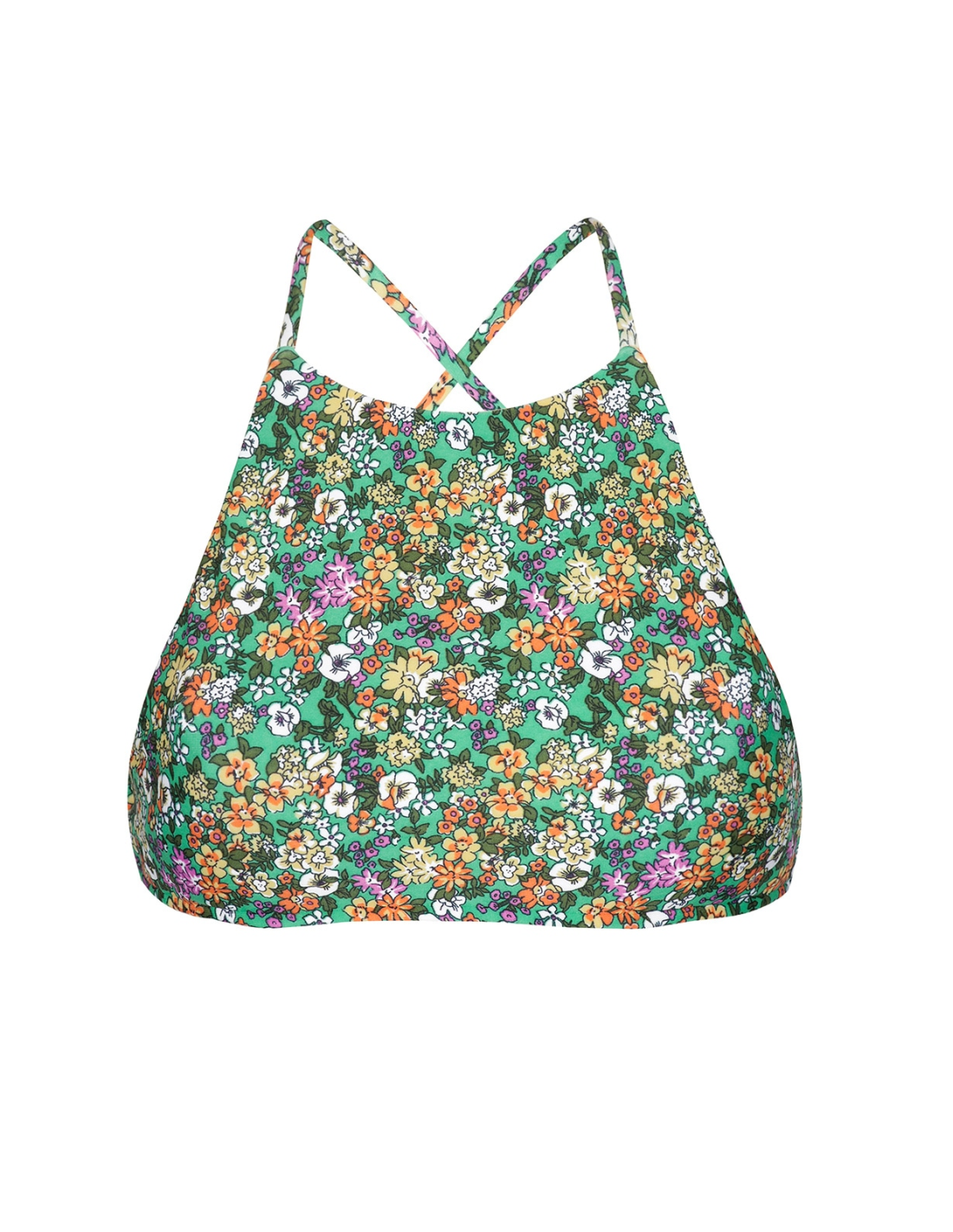 Description Green floral swimsuit crop top, cross-over back - Soutien Iemanja Sporty Rio de Sol