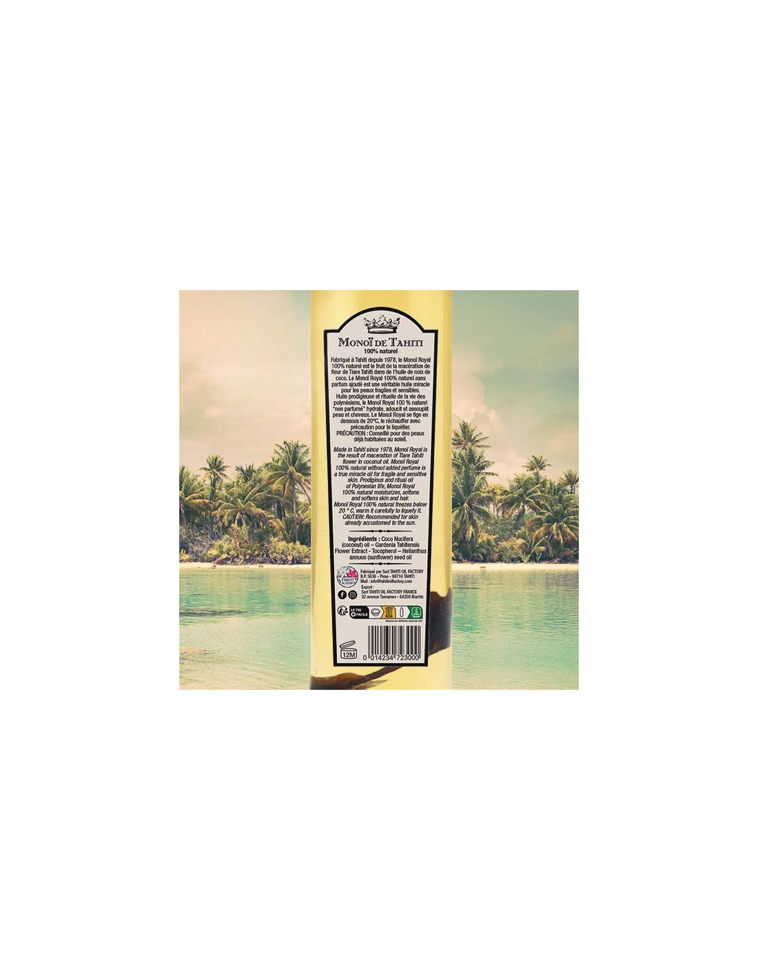 • Composition: 100% Monoï de Tahiti Appellation d'Origine 100 % naturel. Sans colorant. Sans filtre solaire. Non testée sur les animaux. Une fleur de Tiaré dans ce flacon. Sans colorant. Avec un conservateur naturel. Coco nucifera (coconut) oil, Gardenia tahitenti