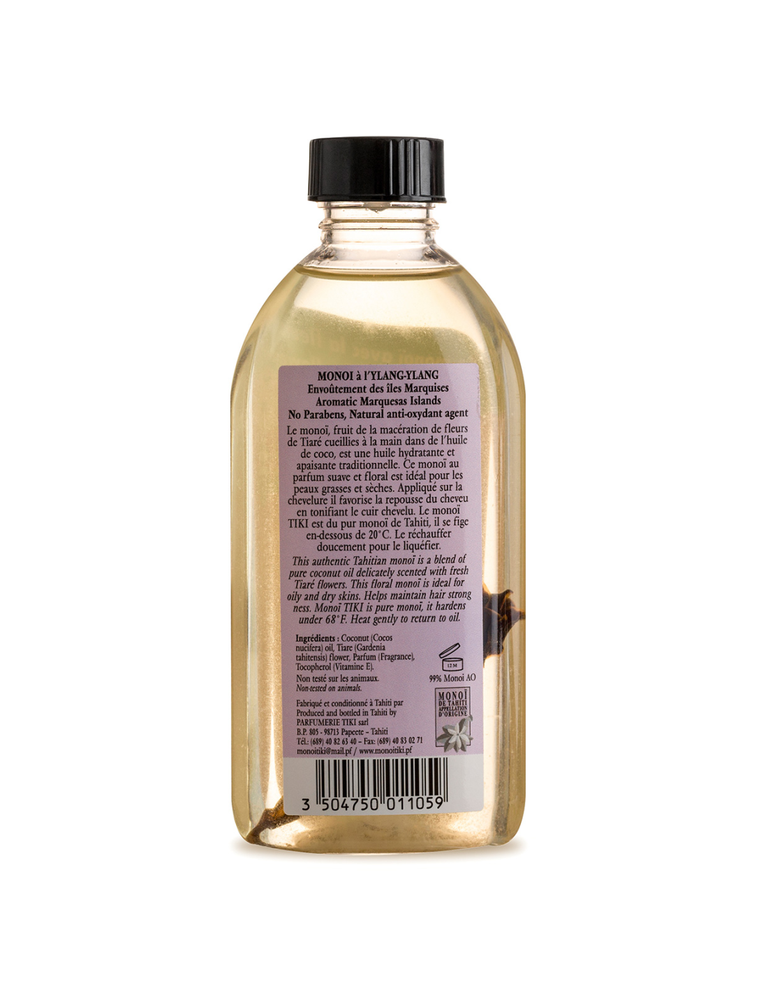 Description Ylang-ylang scented Monoï with flower, made in Tahiti - Tiki Monoi Ylang Ylang 120 Ml Tiki